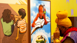 Karingana – Presenças Negras no Livro para as Infância é fruto de pesquisa pautada nos valores civilizatórios afro-brasileiros, como circularidade, ludicidade, ancestralidade e comunitarismo, numa construção entre curadoria e a equipe de programação do Sesc Bom Retiro. A exposição leva diversão a todos os públicos, sempre pautada por um teor de reflexão propositiva sobre a necessidade de desconstrução dos estigmas criados pelo status quo dominante desde os tempos de colonização. Nas duas entradas da exposição os visitantes são surpreendidos por belas instalações: um peixe, inspirado na obra de Zeka Cintra para o livro ‘Oranyan e a Grande Pescaria’, e, do outro lado, a professora Amara, vinda de desenho de Tutano Nômade no livro ‘Afrofuturismo: Ancestral do Amanhã’ (ed. Kitembo), que presenteia a todos com um abraço almofadado.